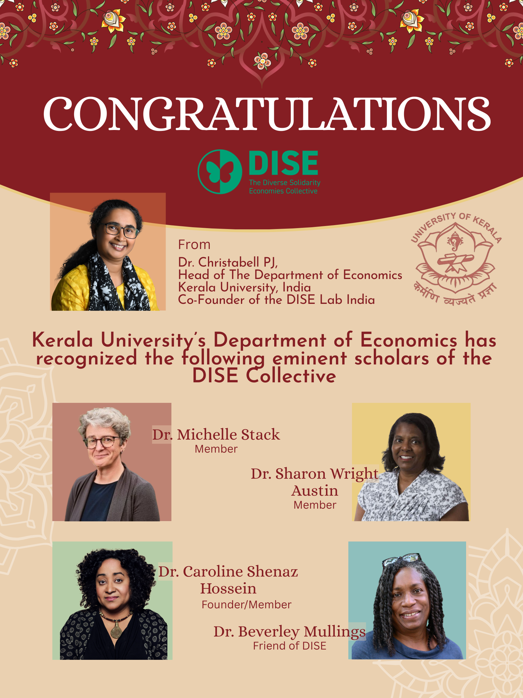 The Department of Economics at Kerala University specializes in applied economics and development issues with a vision and mission of providing a value-based quality education. DISE Collective members Michelle Stack, Sharon Austin, and Caroline Hossein, along with friend of The Collective Beverley Mullings, have helped to advance research and awareness into these subjects, while also meeting the department’s high standards of teaching rigour.